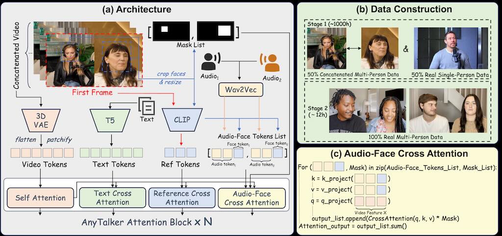 AnyTalker,一個基於音訊的多人對話的開源視訊生成框架。它採用靈活的多流結構,既能擴展身份規模,又能確保身份之間的無縫互動。
